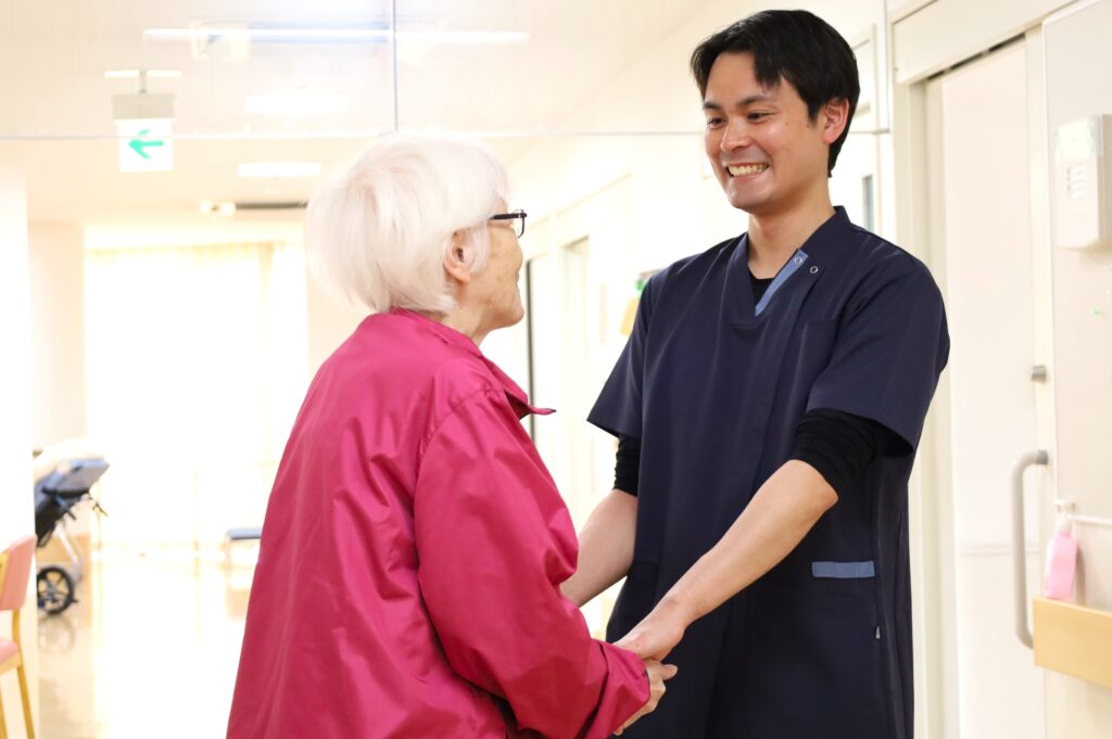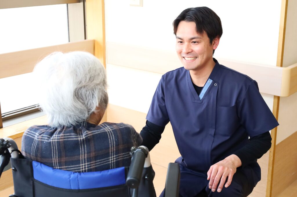 入所棟の職員は20代前半の職員が多く、しっかりコミュニケーションを取りながら、お互いが成長できるよう意見を出し合っています。ご利用者様の「家に帰りたい・歩きたい」といった希望を叶えることができるよう、介護福祉士と多職種が協働して支援しています。多職種との関わりが多く、介護福祉士だけの視点ではなく、色々な視点で支援方法を考える事ができ、自分たちの成長に繋がっています。
