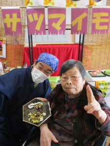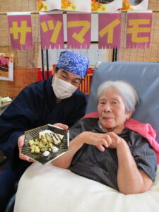 そして今回は焼き芋屋台風の演出もあり作務衣を着たスタッフが威勢よく「いらっしゃ~い!美味しいお芋ができたよ~」の呼び声もあり中央フロアが活気付き皆でわいわいしながらおやつの時間を楽しみました☺