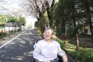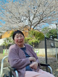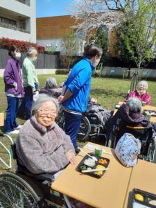 4月には施設の前の小道に桜並木があります。満開時にはお昼ご飯を食べたり皆様で散歩したり🎵