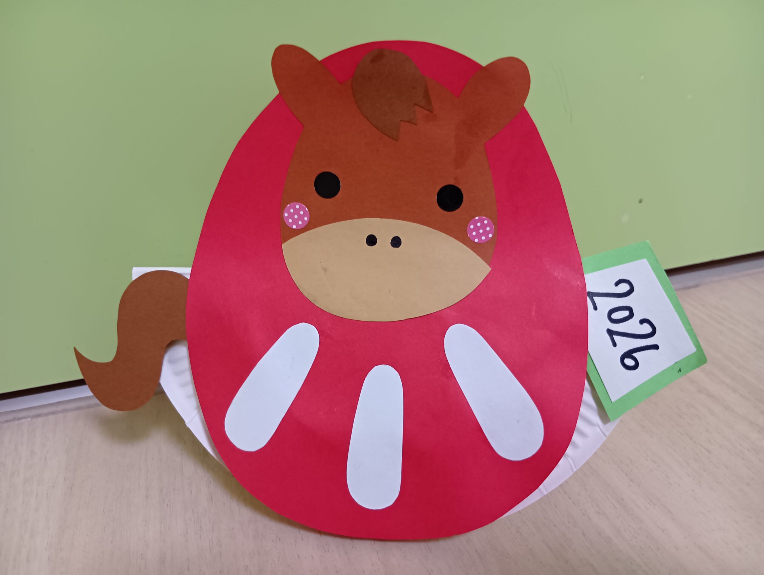 さて、今月の製作の紹介です。今年は“何事も全てウマ🐎くいく!”の午年ですね。保育室では【お馬さんだるま】の製作を準備しましたよ。