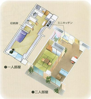 1人部屋46室、2人部屋2室をご用意しています。ミニキッチンもお部屋についています。